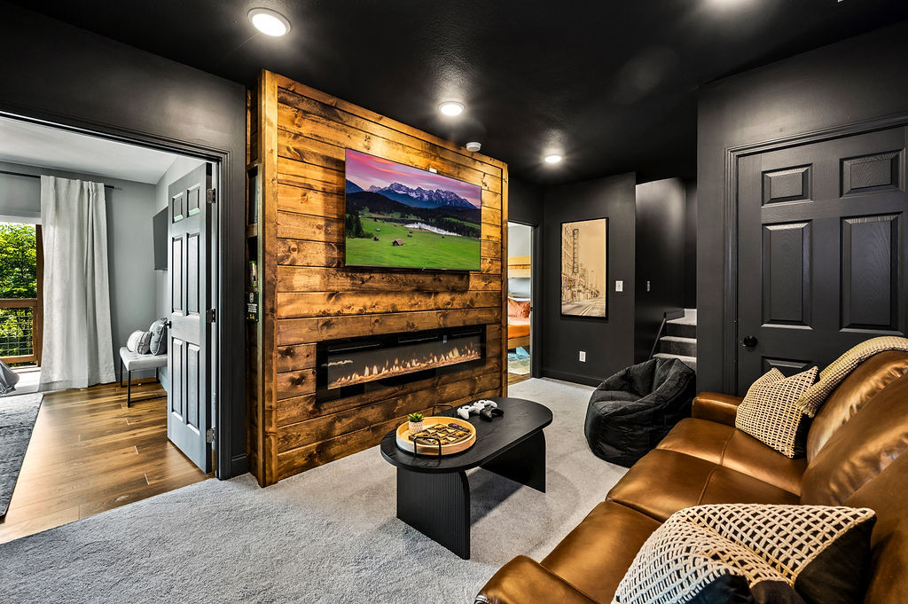 If outdoor dining is more your style, step outside to the covered patio, where you’ll find a 6 burner propane grill. Guests can lounge on the comfortable oversized couch in front of the outdoor fireplace with a 65-inch TV overhead, relax in the twin-XL daybed swing, or take a dip in the 6-person hot tub while taking in the treetop views.